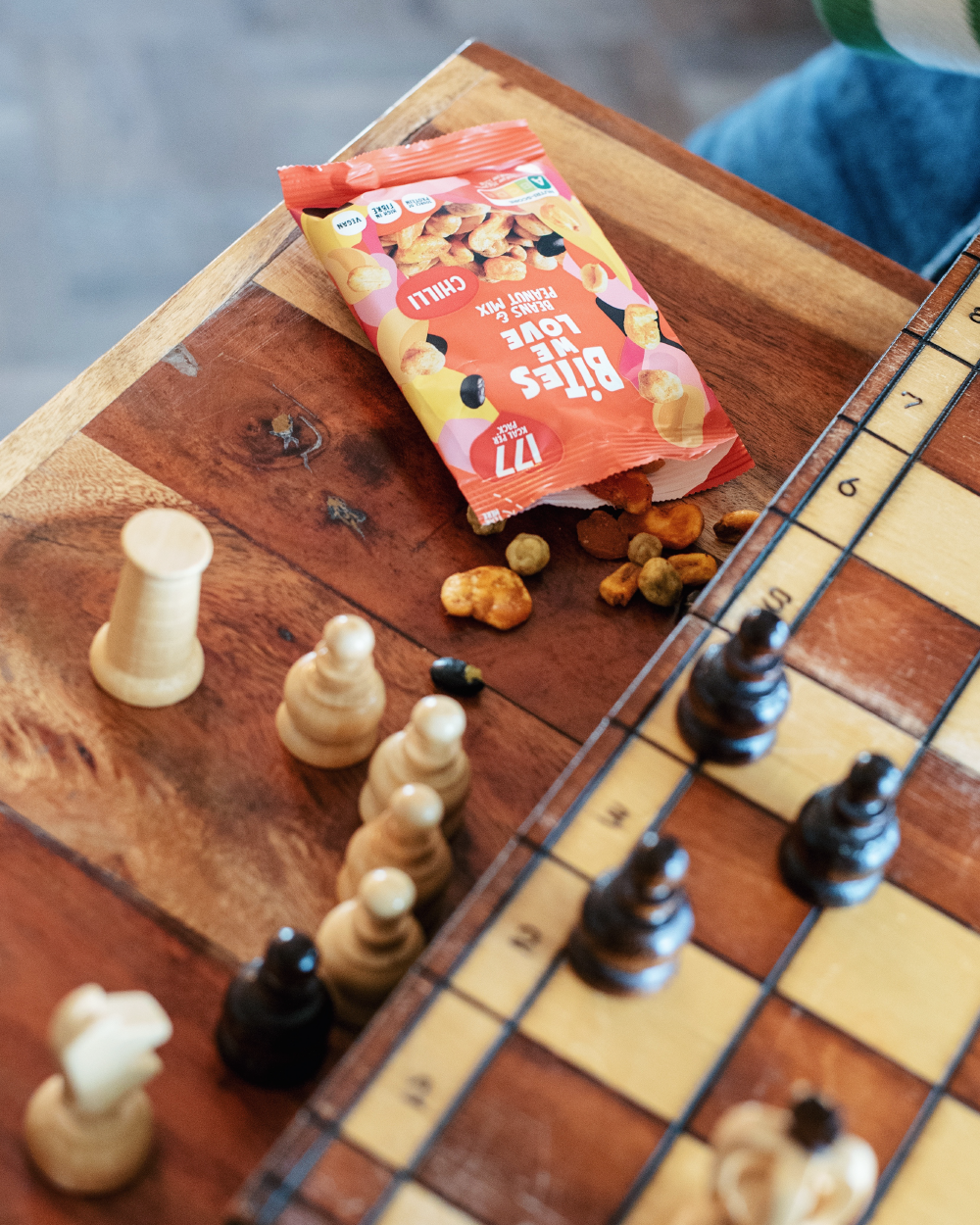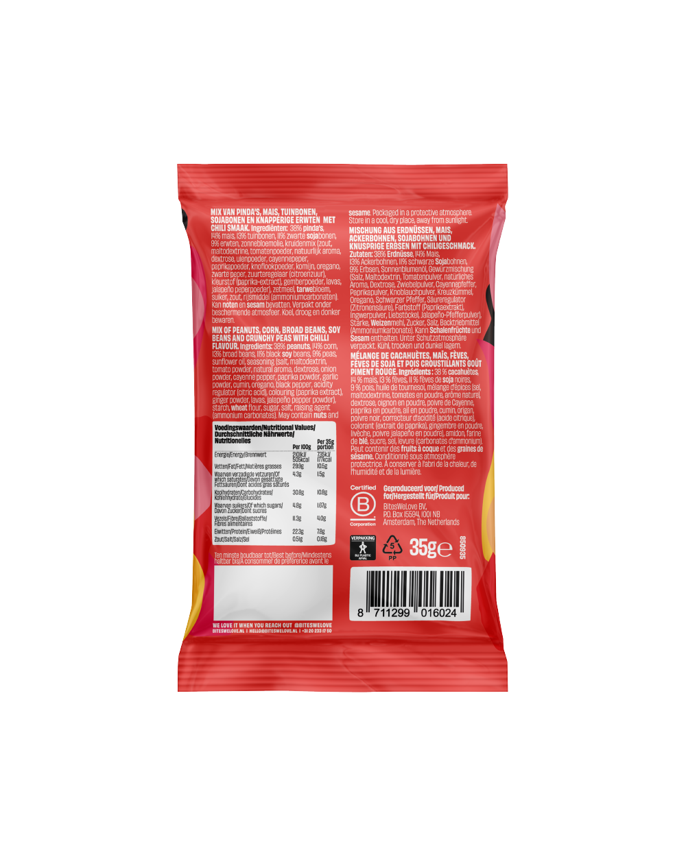 Een pittige mix van geroosterde pinda’s, tuinbonen en zwarte sojabonen – voor een smaakexplosie bij elke hap.